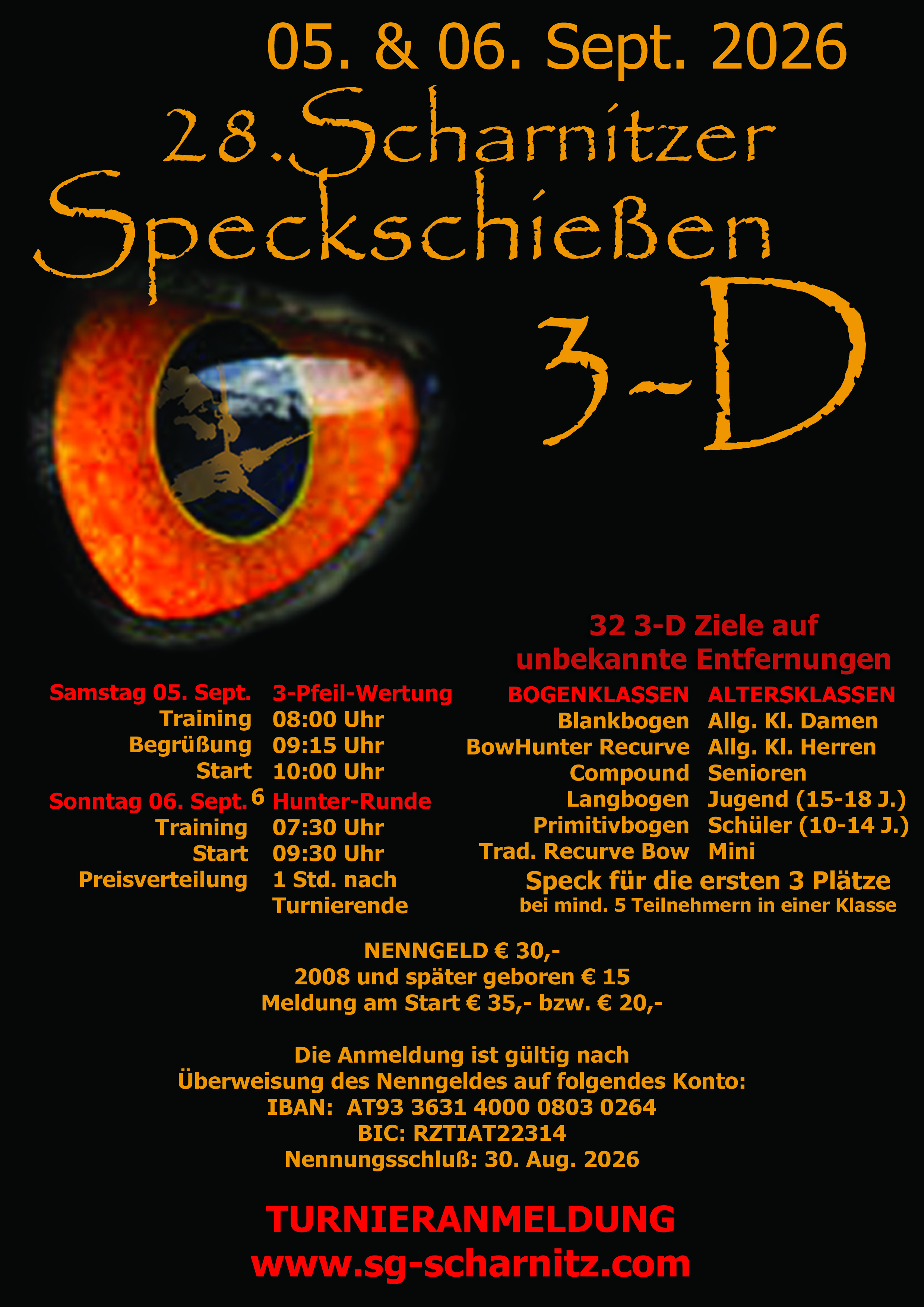 ACHTUNG - Vorkasse – Meldeschluss ist der 30.08.2026! Am 01.09.2026 werden alle Teilnehmer, die noch nicht das Startgeld bezahlt haben von der Liste der Anmeldung gelöscht. Danach besteht die Möglichkeit der Neuanmeldung wenn noch Startplätze frei sind. Die Rückerstattung des Startgeldes bei Nichterscheinen ist ausgeschlossen. Die Teilnahme am Turnier erfolgt auf eigene Gefahr! Jeder Schütze ist für seine Pfeile selbst verantwortlich! Der Veranstalter übernimmt keine Haftung! E